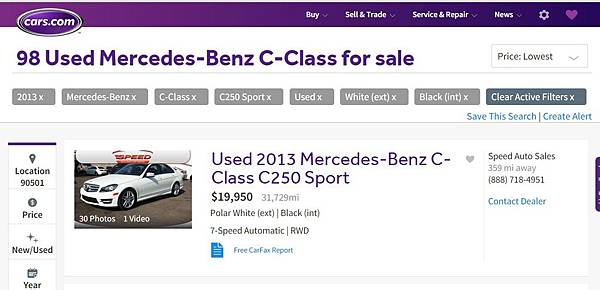 目前全美國有98台車可以選,其中最高是28998美金,跑了26237miles,是賓士經銷商Mercedes-Benz of Temecula 的車,pre-owned vehicles原廠認證,又有PREMIUM 1 PKG、又有PREMIUM 2 PKG、智慧型頭燈LIGHTING PKG 及HID 燈、電動可調跑車椅附腰靠調整…反正您想的幾乎都有!