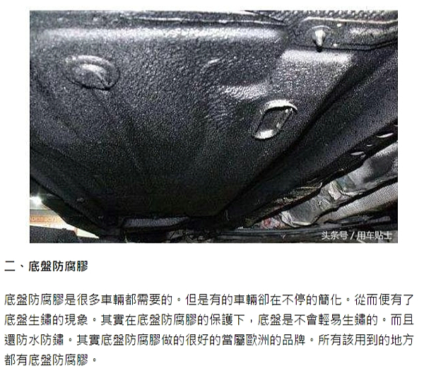 在之前因緣巧合跟德國車商聊到,他們說德國下雪也很嚴重,下雪就會用鹽處理,那就很容易沾附在底盤上或一些外露零件上面造成鏽蝕,所以只要是歐洲比較大的品牌汽車,在該噴塗的地方都會處理到,可以說,整車都被包裹住了,想生鏽都難。但有些品牌的汽車在這方面就做得非常差勁,甚至可以說是"裸奔"。這一點有機會我會找一台德國進口外匯車來實證看看。
