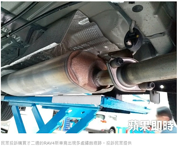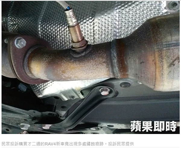 而在台灣,可能是熱帶地方,所以我們進來的車並不這麼重視底盤生鏽的問題,這樣似乎更糟糕,看一下蘋果日報上說的,劉小姐表示,去年12月底向台北敦化營業所下訂購買RAV4 2.0尊爵版,共花了98.5萬元,今年1月11日、農曆年前交車,交車後不久就發現座椅底部有生鏽痕跡,1月29日回廠反映,頂起車輛一看,才發現包含排氣管、部分螺絲接合處,都有生鏽痕跡。